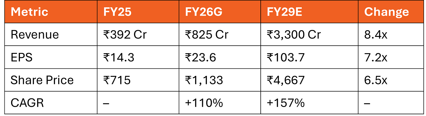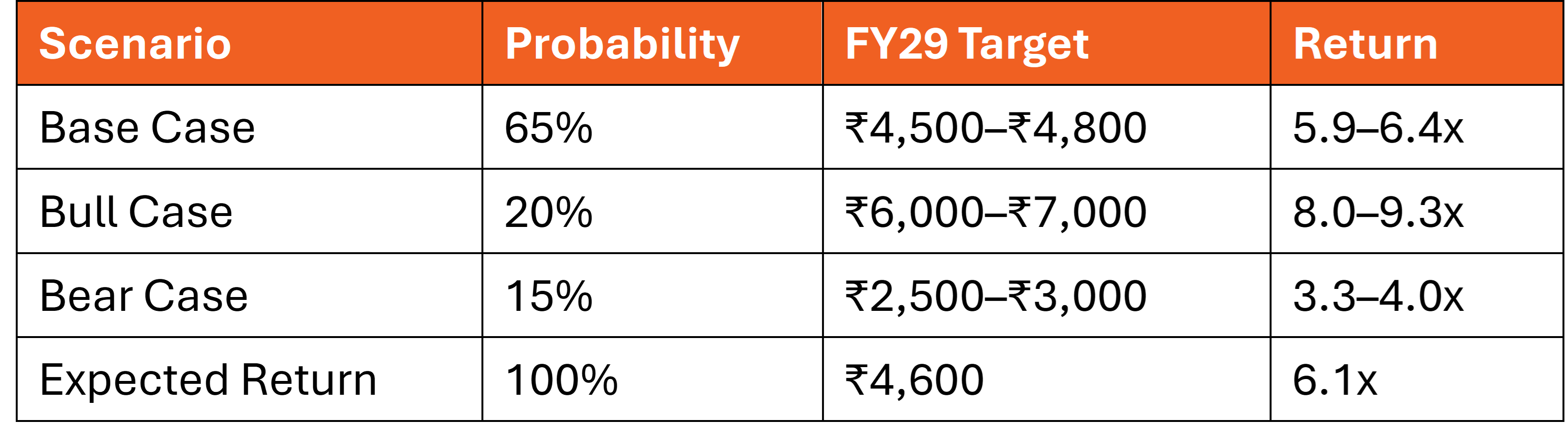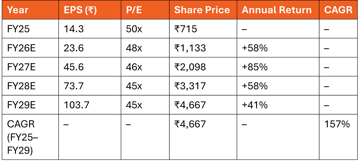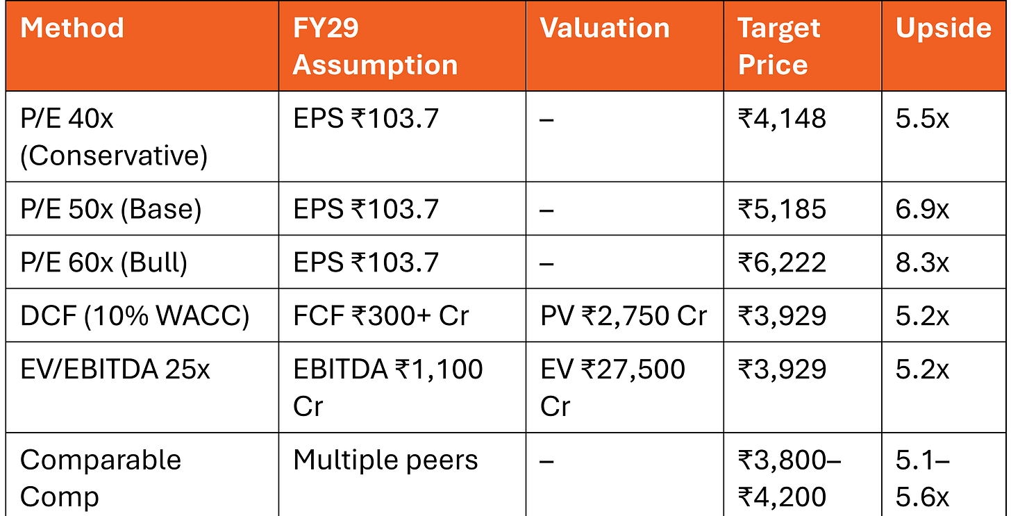 Valuation: Base Case Target ₹3,930–₹5,005/share by FY29 = 5–6.7x returns